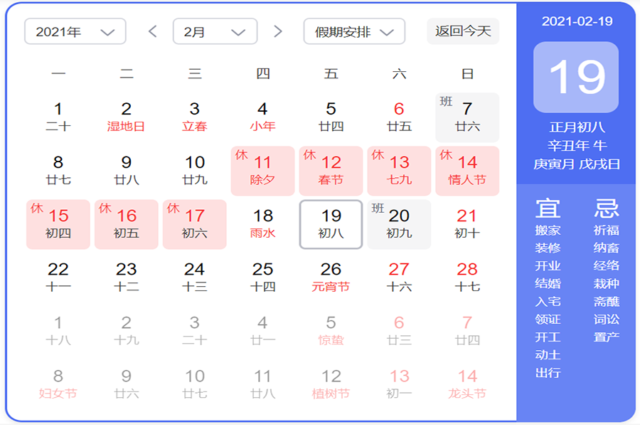 春節(jié)放假時(shí)間為2021年2月6日2月19日,春節(jié)后正式上班時(shí)間為2月19日(正月初八)上班。