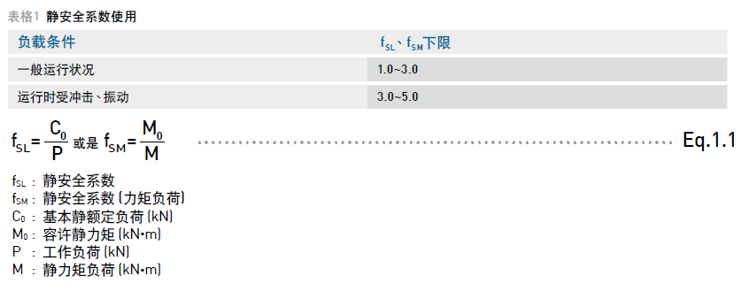 當(dāng)直線導(dǎo)軌使用在慢速運(yùn)動或作動頻率不高的狀況下,需考慮靜安全系數(shù)。根據(jù)不同的使用狀況,計(jì)算靜負(fù)荷必