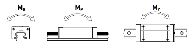 當(dāng)滑塊中受到最大應(yīng)力的鋼珠達(dá)到上述定義之靜額定負(fù)荷時,此時滑塊所承載之力矩稱為靜額定力矩。在直線導(dǎo)軌運(yùn)動中是以MR、MP、MY這三個方向來定義:
