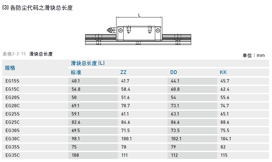 (3) 各防塵代碼之滑塊總長(zhǎng)度