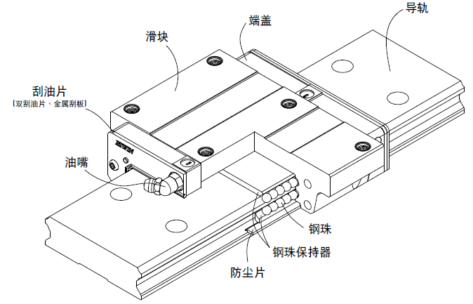 ? 防塵系統(tǒng):刮油片、底面塵封防塵片、導(dǎo)軌螺栓蓋、金屬刮板