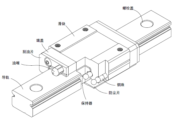 滾動(dòng)循環(huán)系統(tǒng):滑塊、導(dǎo)軌、端蓋、鋼珠、保持器