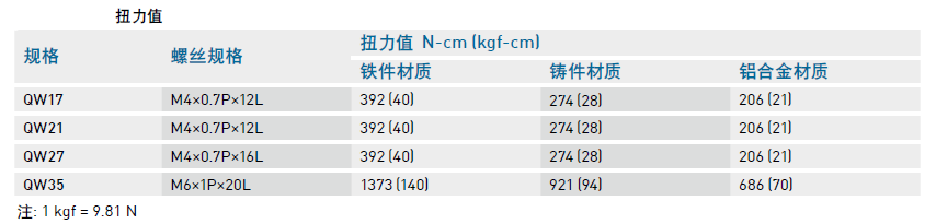 直線導(dǎo)軌精度甚劇,因此為達(dá)到每顆螺絲都能鎖緊的目的,建議使用下列扭力值鎖裝配螺絲。
